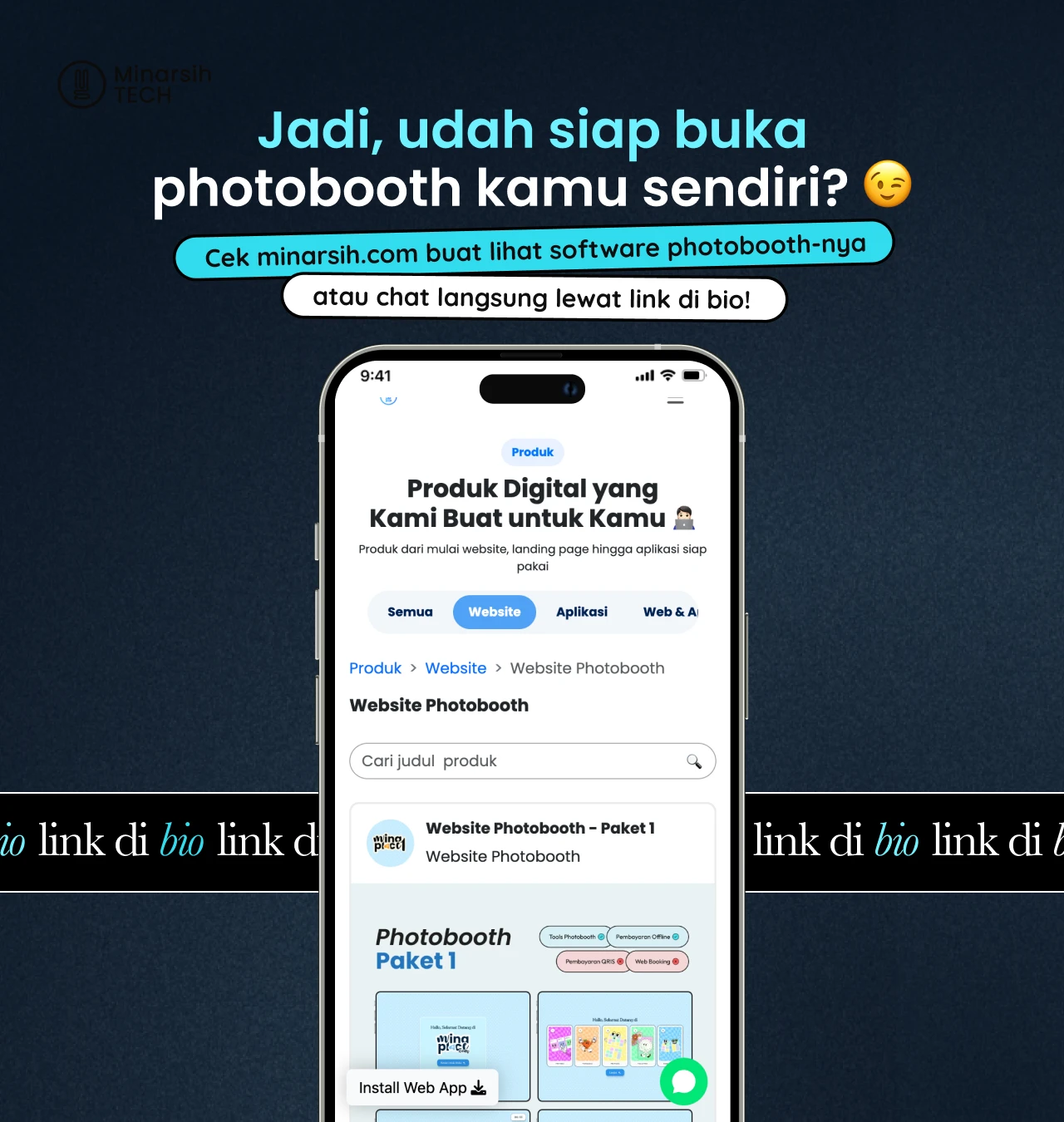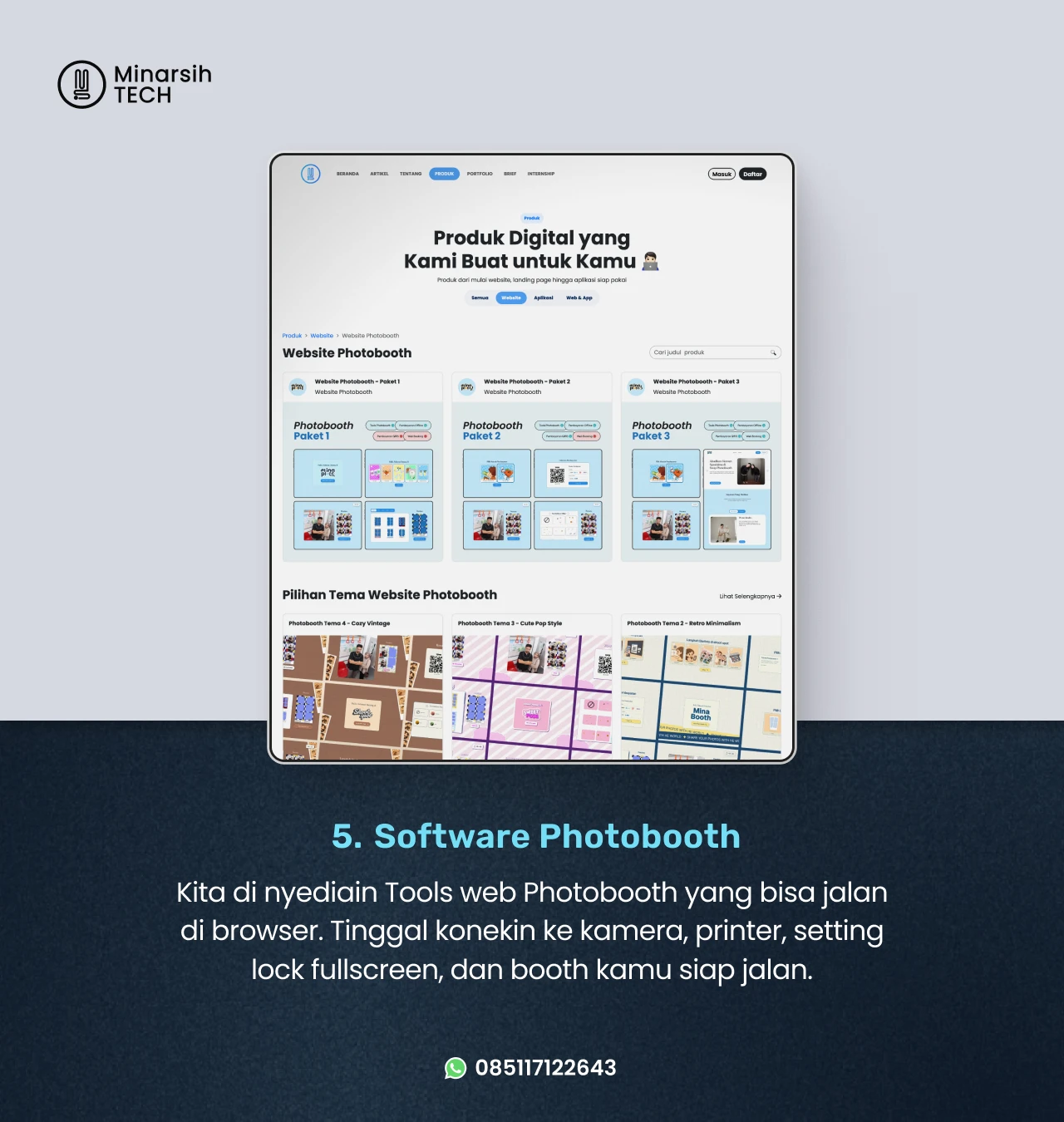 Nah, bagian paling pentingnya: software photobooth-nya. Kami di Minarsih Tech nyediain tools photobooth berbasis web yang bisa langsung jalan di browser. Cukup konekin ke kamera, printer, aktifkan fullscreen mode dan booth kamu langsung siap jalan!