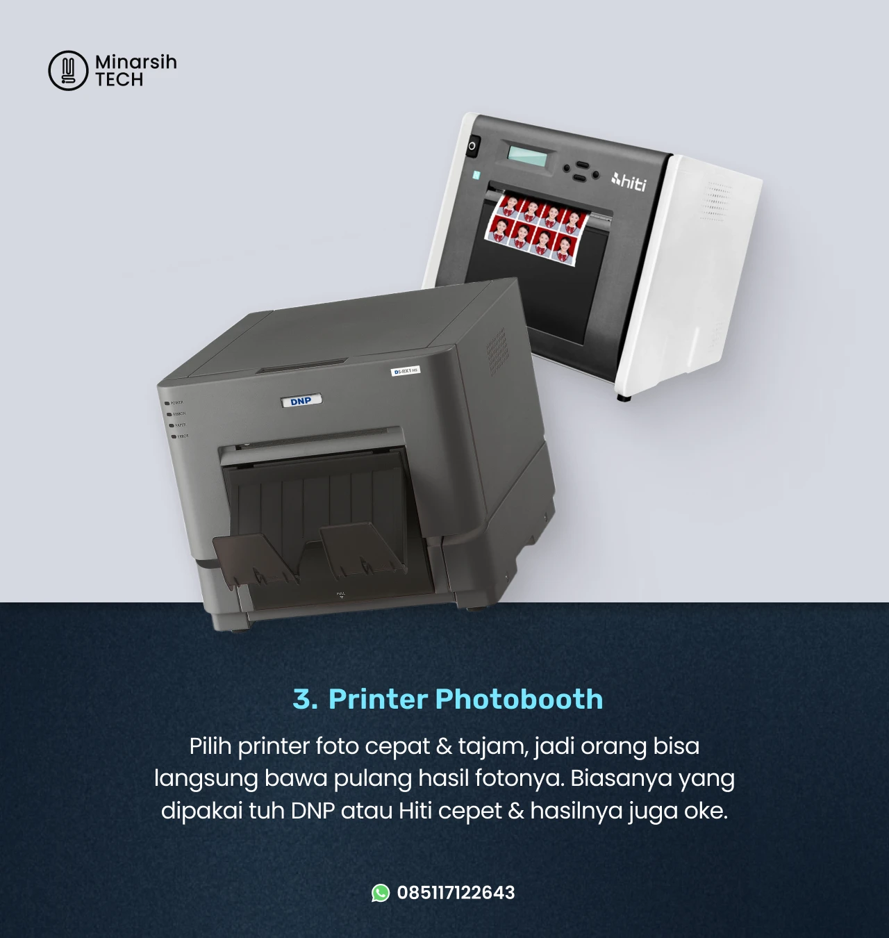 Gunakan printer foto cepat dan tajam supaya hasil foto bisa langsung dibawa pulang. Umumnya, banyak yang pakai DNP atau Hiti karena hasilnya bagus dan proses cetaknya cepat. Jangan lupa install driver printernya di PC, supaya printer bisa langsung terkoneksi dan siap digunakan.