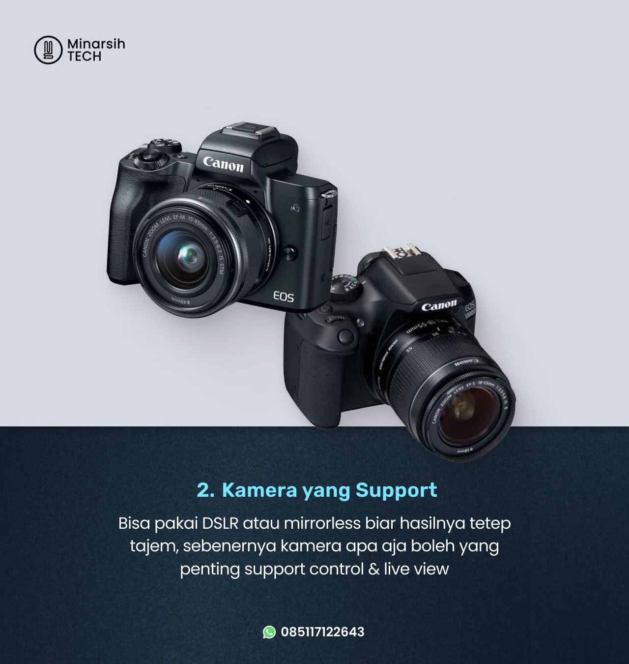 Kamu bisa pakai kamera DSLR atau mirrorless biar hasilnya tetap tajam. Sebenarnya kamera apa pun boleh, asal support control & live view. Pastikan kamu sudah install software webcam utility sesuai merek kamera, supaya kamera bisa dipakai langsung di PC. Sebelum digunakan, kamera juga perlu diatur dulu agar siap dipakai dalam waktu lama tanpa kendala.