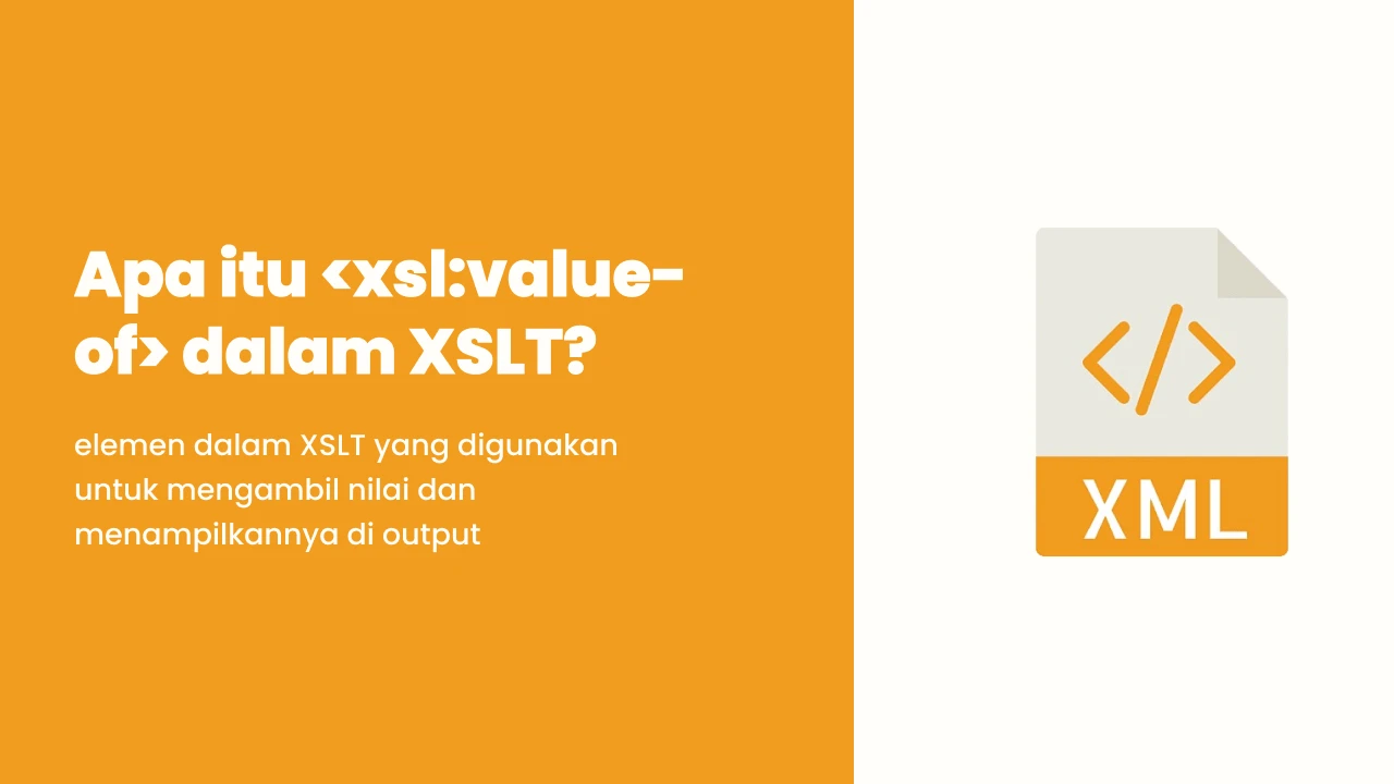 <xsl:value-of> adalah elemen dalam XSLT yang digunakan untuk mengambil nilai dari elemen di file XML dan menampilkannya di output (biasanya dalam bentuk HTML atau teks).
