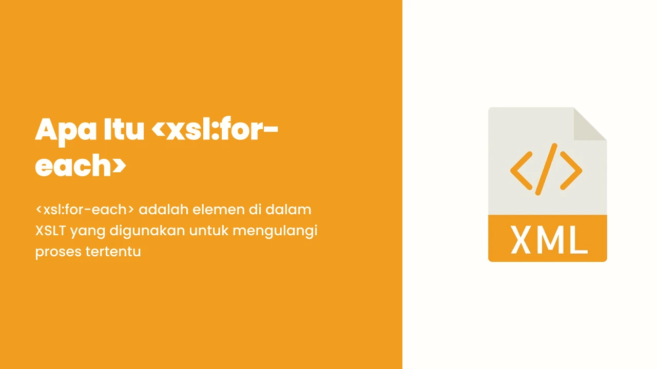 <xsl:for-each> adalah elemen di dalam XSLT yang digunakan untuk mengulangi proses tertentu untuk setiap elemen dalam file XML. Jadi, kalau kamu punya banyak data, misalnya daftar CD, kamu bisa menampilkan semuanya satu per satu dengan xsl:for-each.