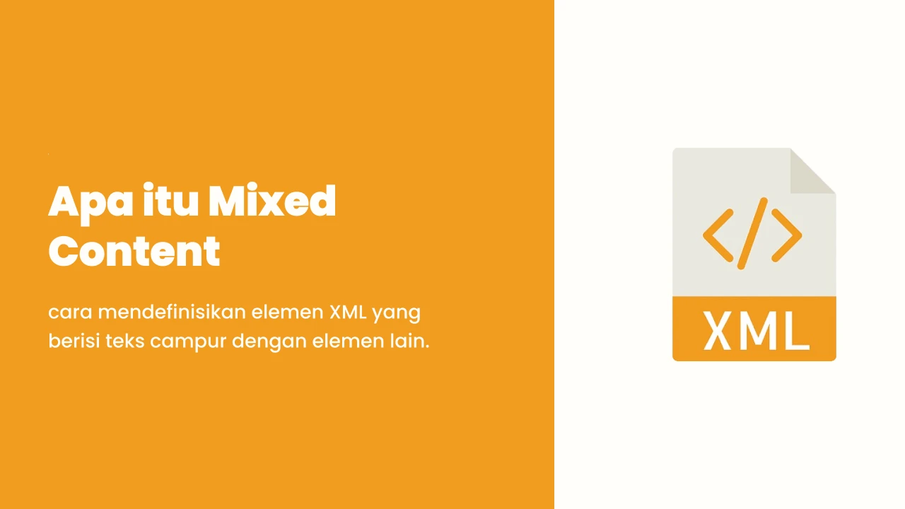 Dalam XML, mixed content artinya sebuah elemen bisa berisi teks biasa dan juga elemen lain di dalamnya.