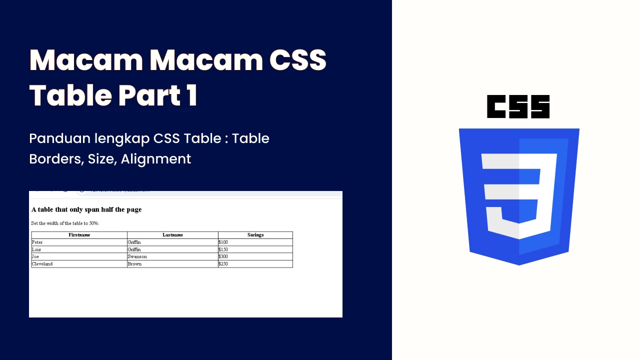 Jika ingin tabel hanya memenuhi setengah halaman, gunakan width: 50%