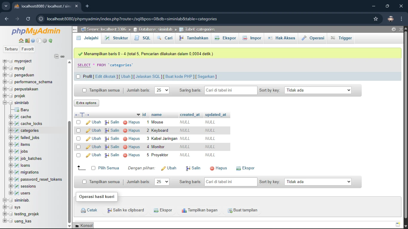 Selamat! Anda telah berhasil membangun struktur database dan mengisinya dengan data awal. Fondasi aplikasi kita sudah benar-benar siap untuk dikembangkan lebih lanjut dengan membuat tampilan (view) dan logika di controller.