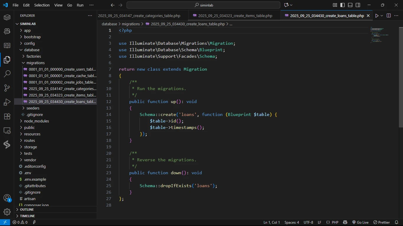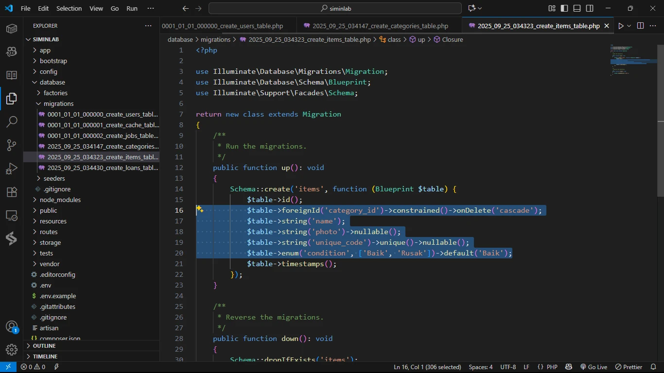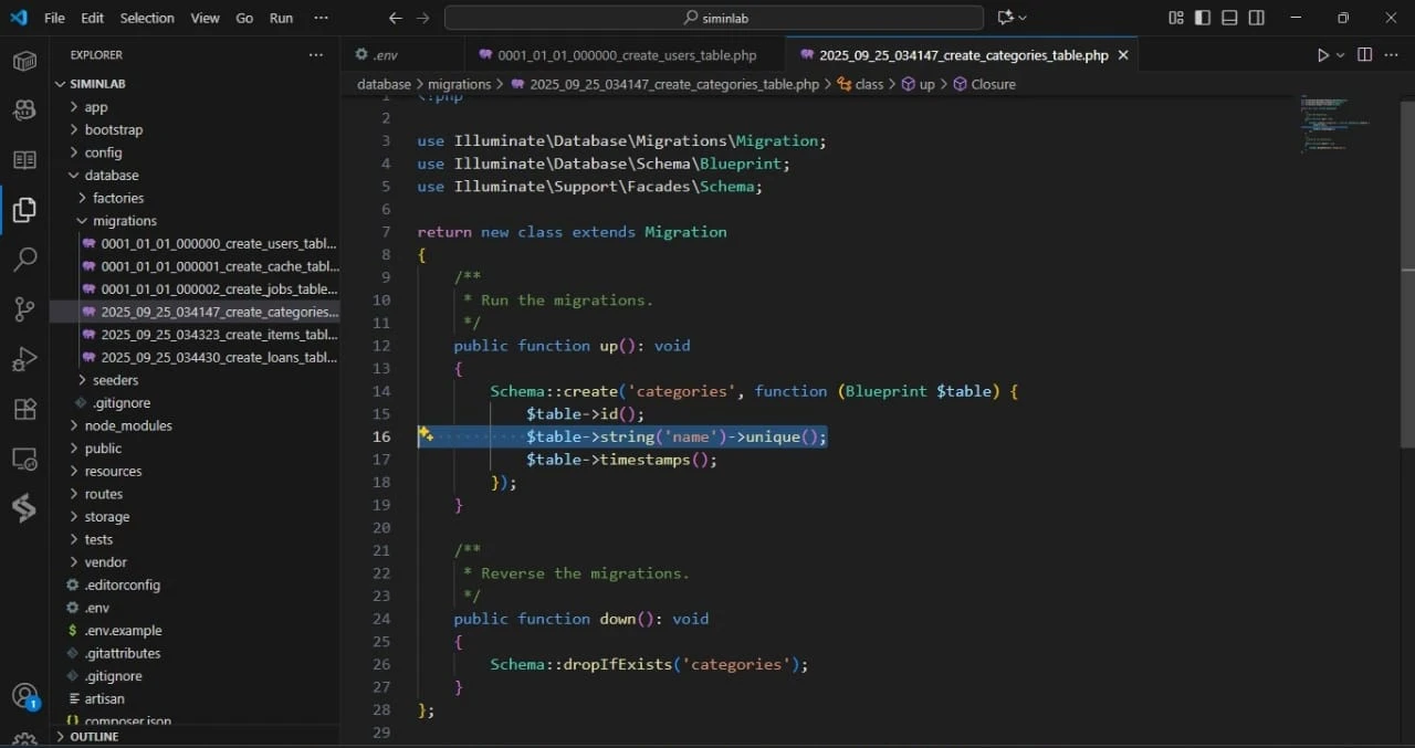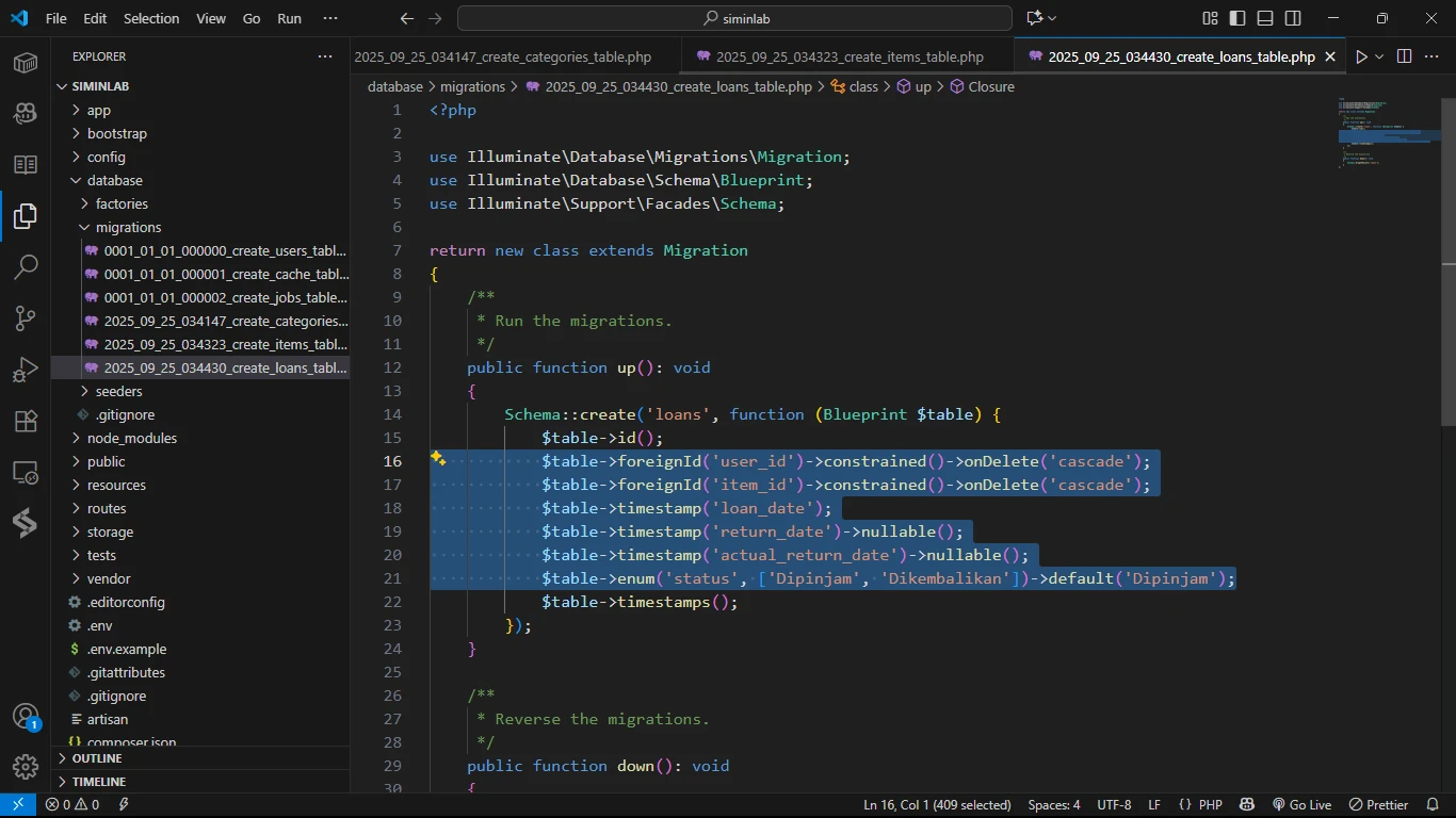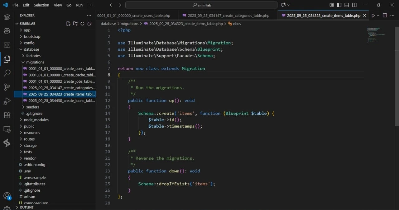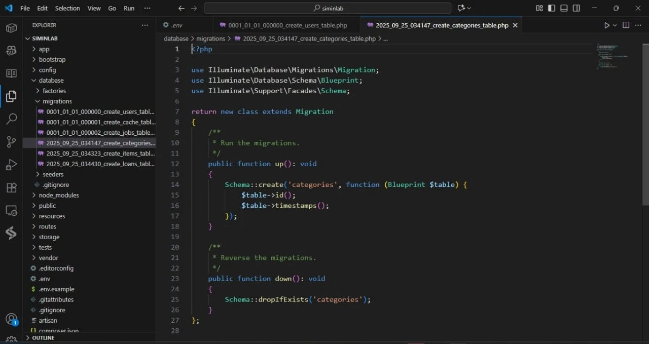 Sekarang saatnya kita mendefinisikan kolom-kolom untuk setiap tabel di dalam file migration-nya, sesuai dengan rancangan yang sudah diperbarui.