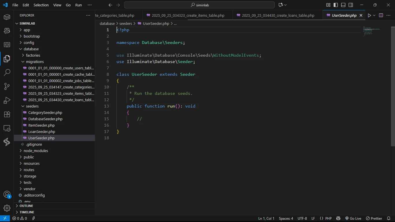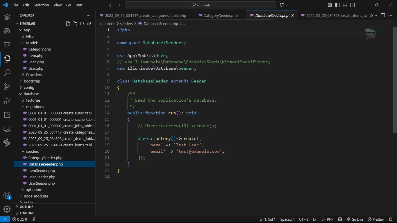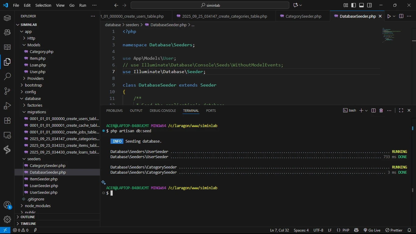 File Seeder untuk Category, Item, dan Loan sudah dibuatkan secara otomatis. Namun, karena kita tidak membuat Model User (sudah ada), kita perlu membuat file UserSeeder secara terpisah.