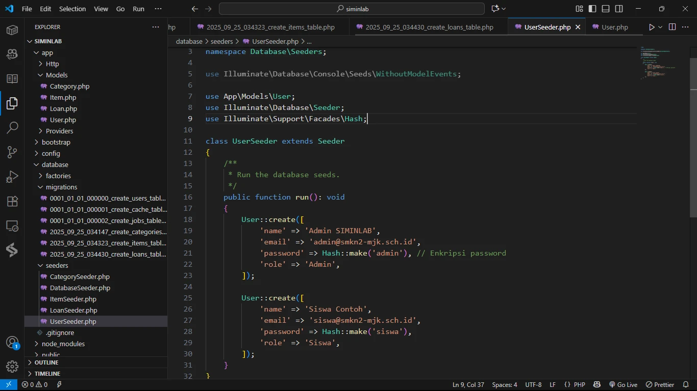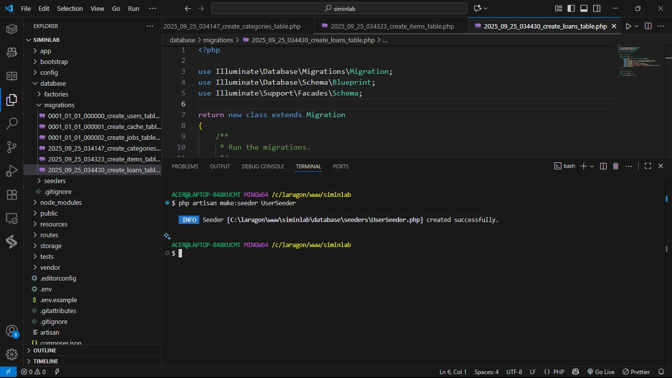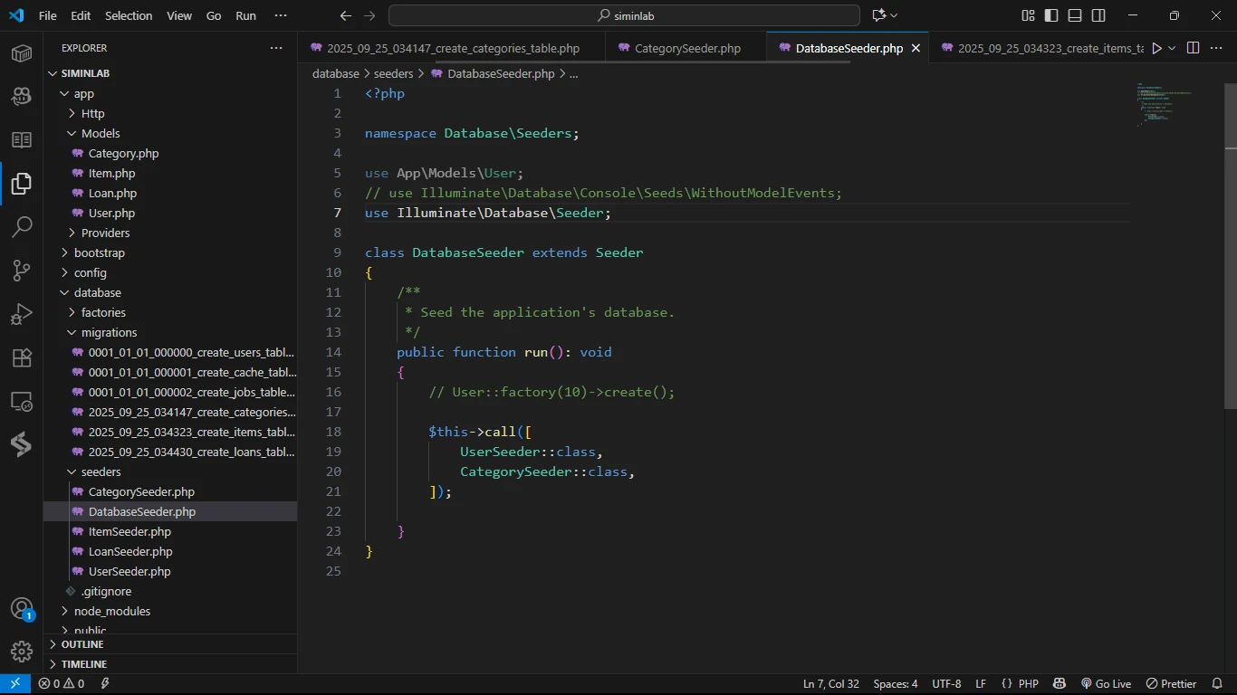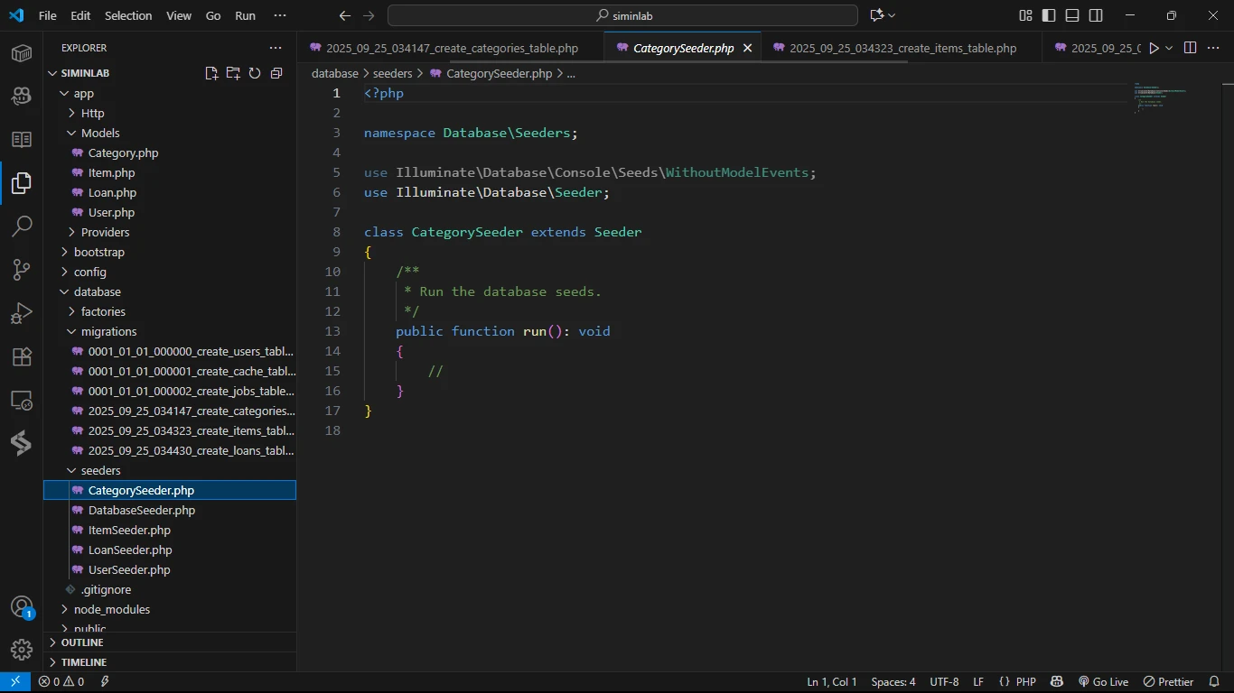 File Seeder untuk Category, Item, dan Loan sudah dibuatkan secara otomatis. Namun, karena kita tidak membuat Model User (sudah ada), kita perlu membuat file UserSeeder secara terpisah.
