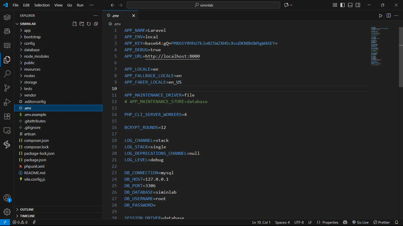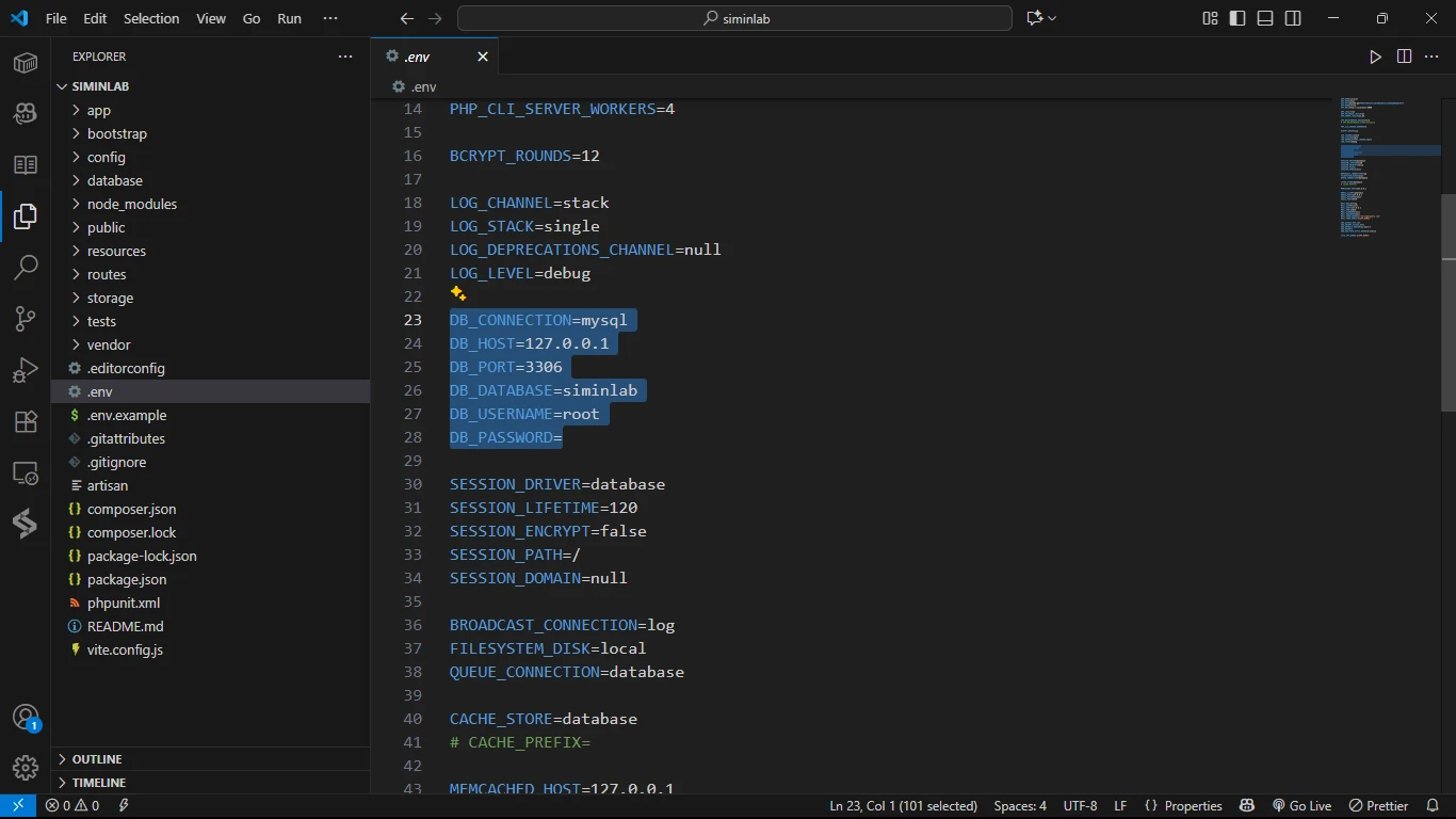 Langkah pertama adalah memberitahu Laravel cara terhubung ke database siminlab yang sudah kita buat.