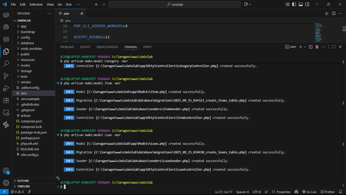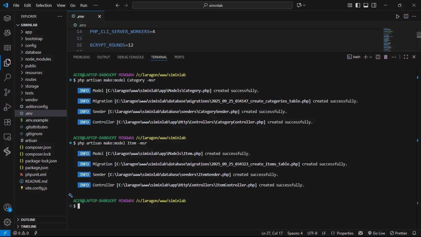 Setelah berhasil menyiapkan "dapur" kita (server Laragon & VS Code), sekarang saatnya kita mulai "memasak". Di bagian ini, kita akan fokus menghubungkan proyek Laravel kita ke database, membangun "cetakan biru" tabel-tabelnya dengan Migrations, dan menyiapkan file-file utama (Model, Seeder, Controller) yang akan menjadi otak dari aplikasi kita.