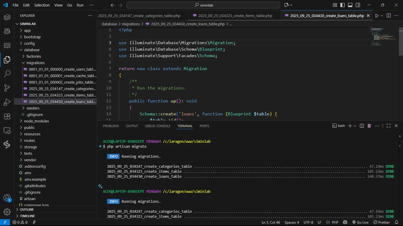 Sedikit Pembahasan: Saat ini kita tidak melakukan pengisian data pada Seeder Item dan Loan, karena sebenarnya yang paling penting kita sudah menyiapkan data pada tabel utama atau parent yaitu pada seeder Users dan Category. Nantinya Anda bisa melakukan pengisian Seeder Item dan Loan sendiri ketika memang diperlukan atau ketika Anda ingin menerapkan pemahan dari apa yang sudah dipelajari dari materi Seeder ini.