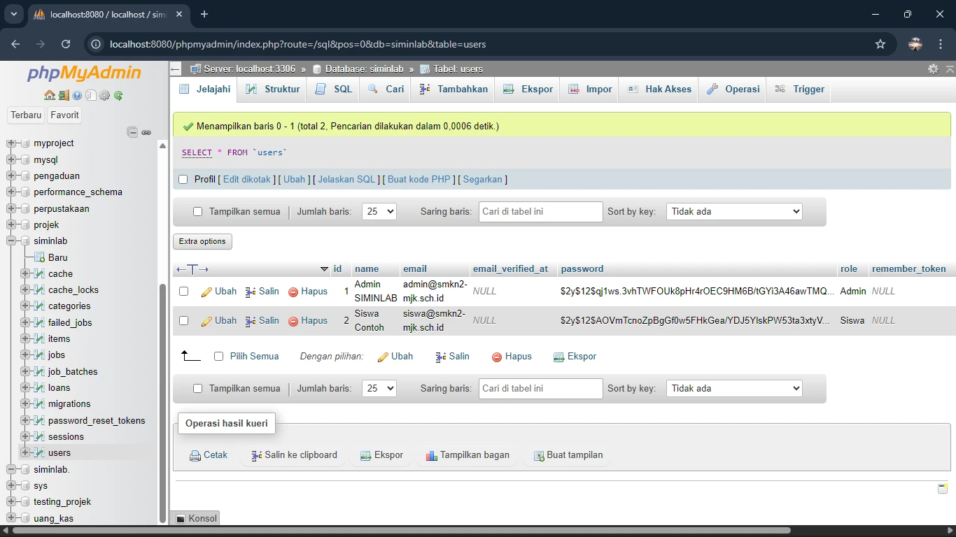 $table->enum('role', ['Admin', 'Siswa'])->default('siswa'); // Tambahkan ini