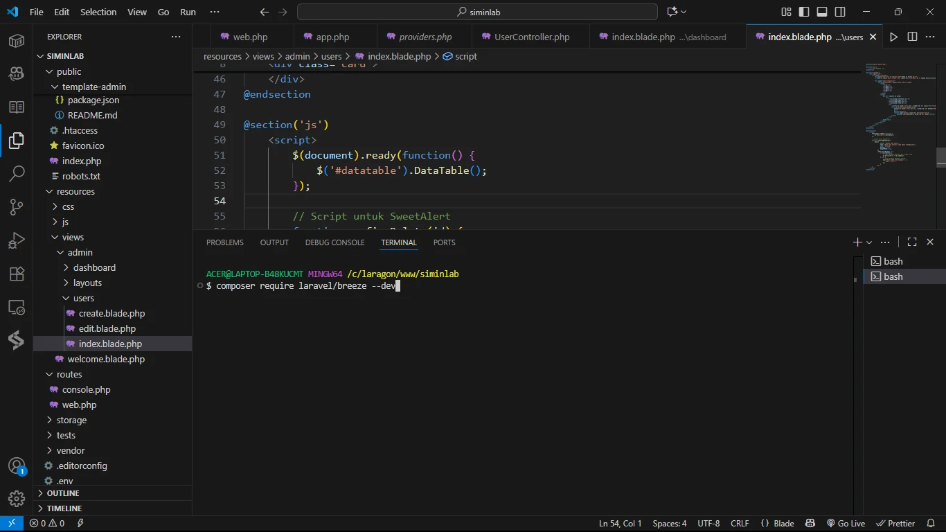 Langkah pertama adalah menambahkan Laravel Breeze ke dalam proyek kita. Breeze akan secara otomatis membuatkan semua file yang kita butuhkan untuk sistem autentikasi.